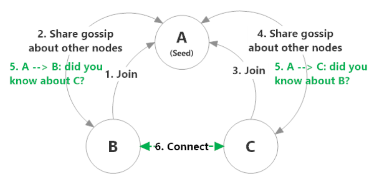 加入首种子节点或种子节点的节点信息,会通过Gossip协议的传播方式传播给当前已加入的所有节点,以完成集群组建。当集群组建完成后,就不存在种子节点与普通节点之分了,每个节点均可执行Actor应用程序。