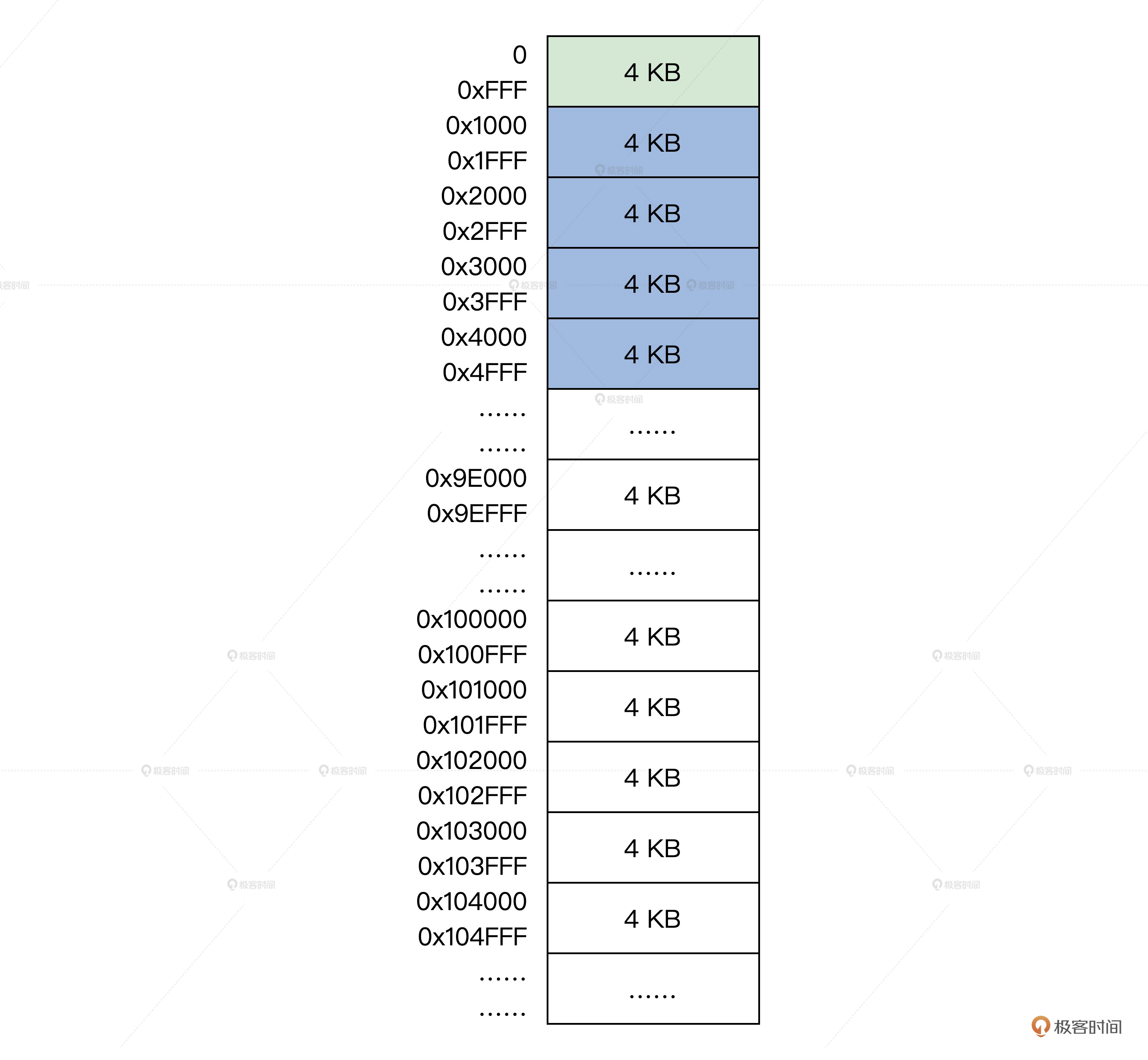 上图这是一个接近真实机器的情况,不过一定不要忘记前面的内存布局示图,真实的物理内存地址空间不是连续的,这中间可能有空洞,可能是显存,也可能是外设的寄存器。