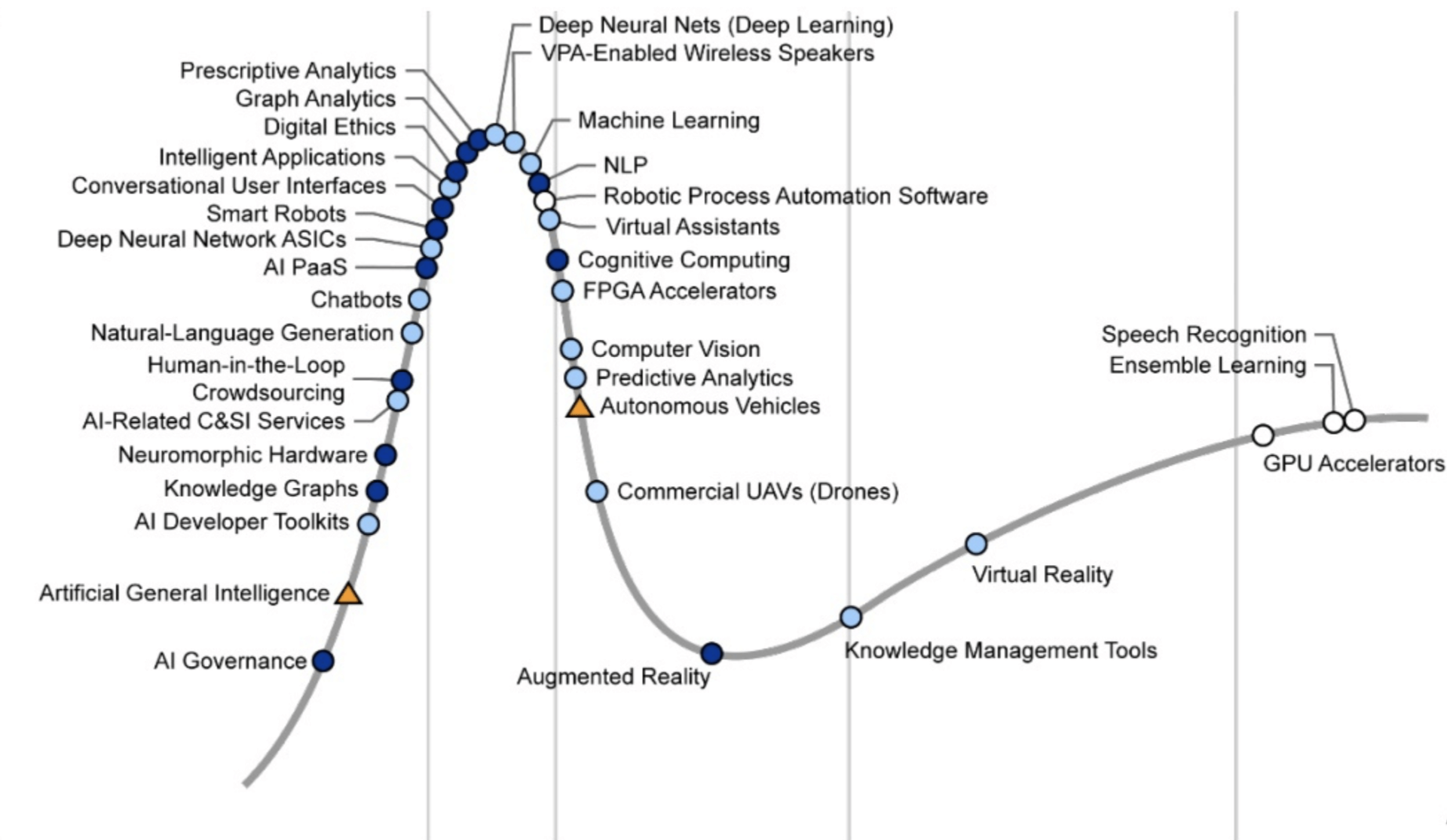 处于顶部,被众人期待,但是可能有些过热的人工智能技术包括: