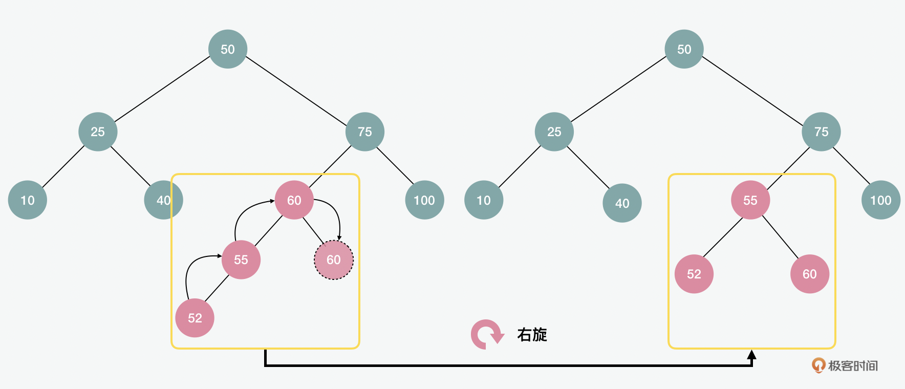 为了在插入后保持平衡,AVL树会通过左旋或右旋的方式来调整。比如以上的例子就是左旋,下面的例子中,我们也可以看到右旋。在理想的状态下,AVL的复杂度是$O(log2(n))$。但是当有频繁的插入、删除等操作的时候,效率就会下降。在极端情况下它的复杂度会退化到$O(n)$。