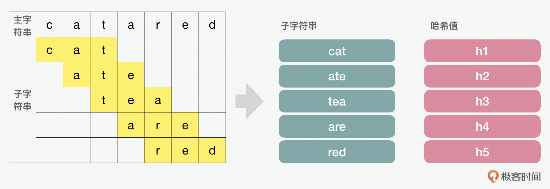 说完了BM和KMP,我们最后再来再看一下RK算法。这种方式的匹配方法是用一个字符串中的子串和模式串的哈希值做对比,如果哈希值是相等的,那就证明匹配上了。