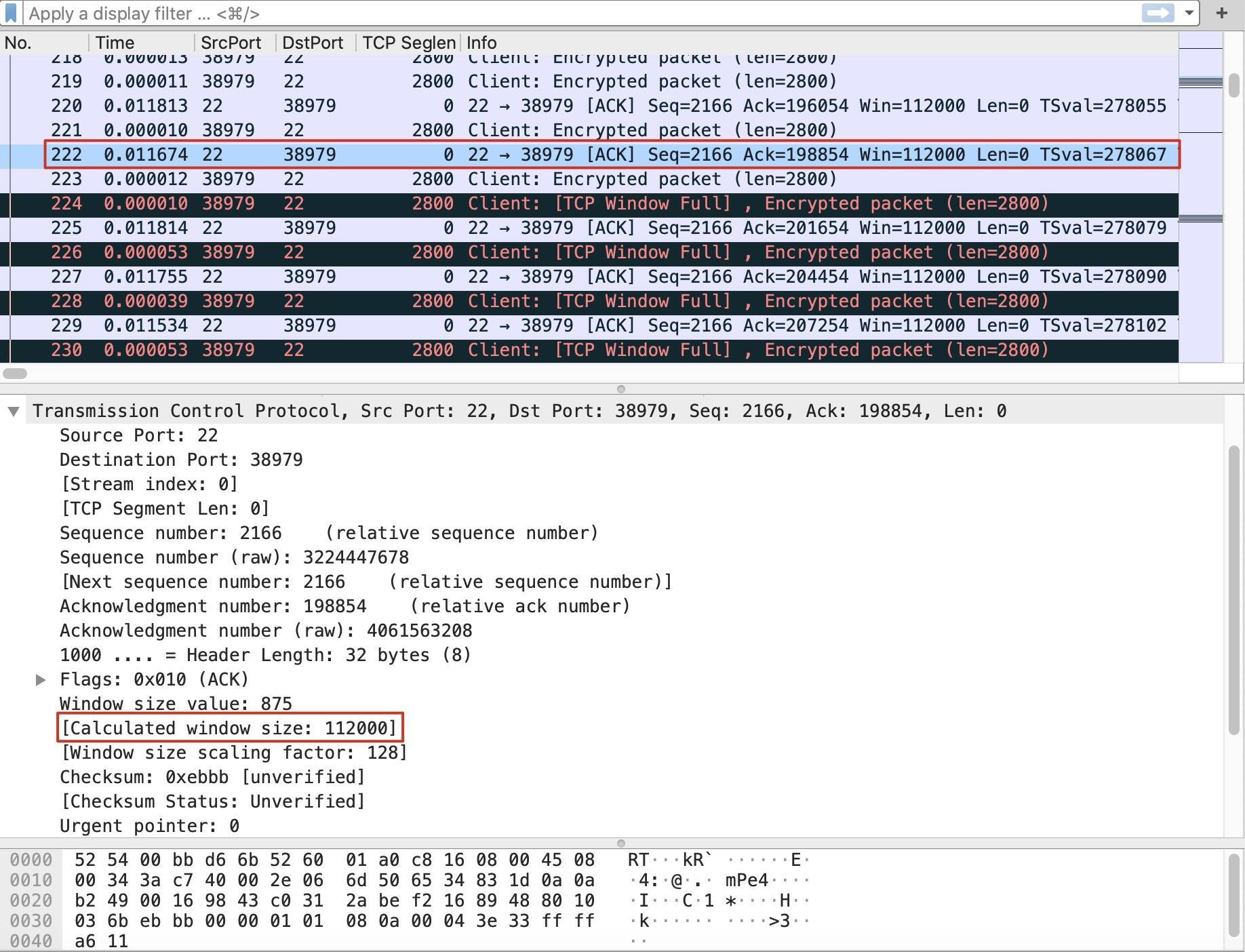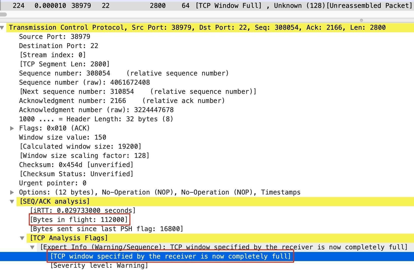 因为这次通信是SCP文件传输,那么A就是客户端,它的端口是38979;B就是服务端,它的端口是22。我们的具体做法是:在抓包文件里,找到B(也就是源端口为22)的报文,而且应该是这个TCP Window Full报文之前的最近的一个,在这个报文里就有B的最近的接收窗口值。