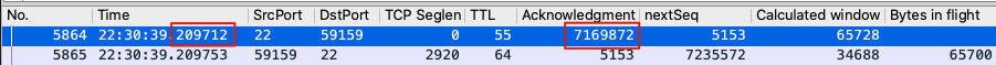 然后在22:30:39.209712,接收端的确认号为7169872: