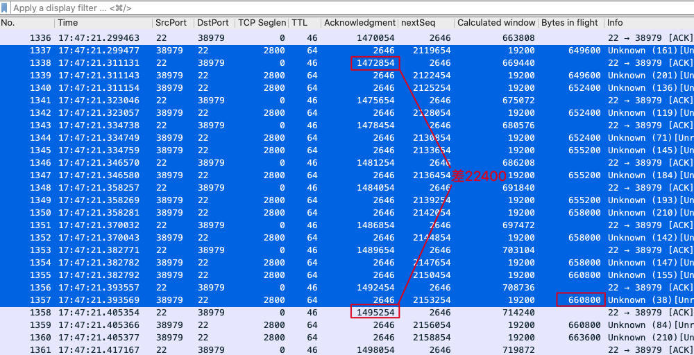 还是1337到1357号报文,我们去掉了过滤器 tcp.srcport eq 38979,这样就展示了双向报文。可以看到,服务端(B端)在这段时间内,只确认了22400字节(1495254 - 1472854),而同样时刻的在途数据,却一直维持在一个比较高的数字,在660KB上下。所以,真正完成了传输的数据量,是前者22400B,而不是“虚浮”的660KB。