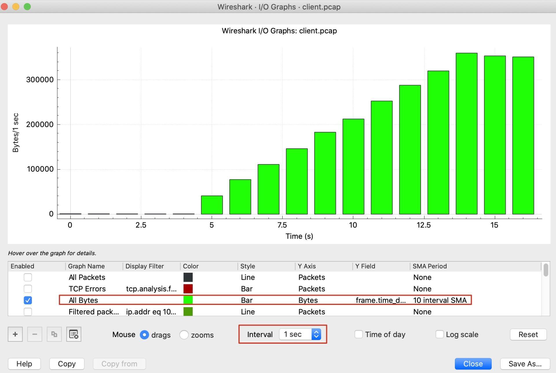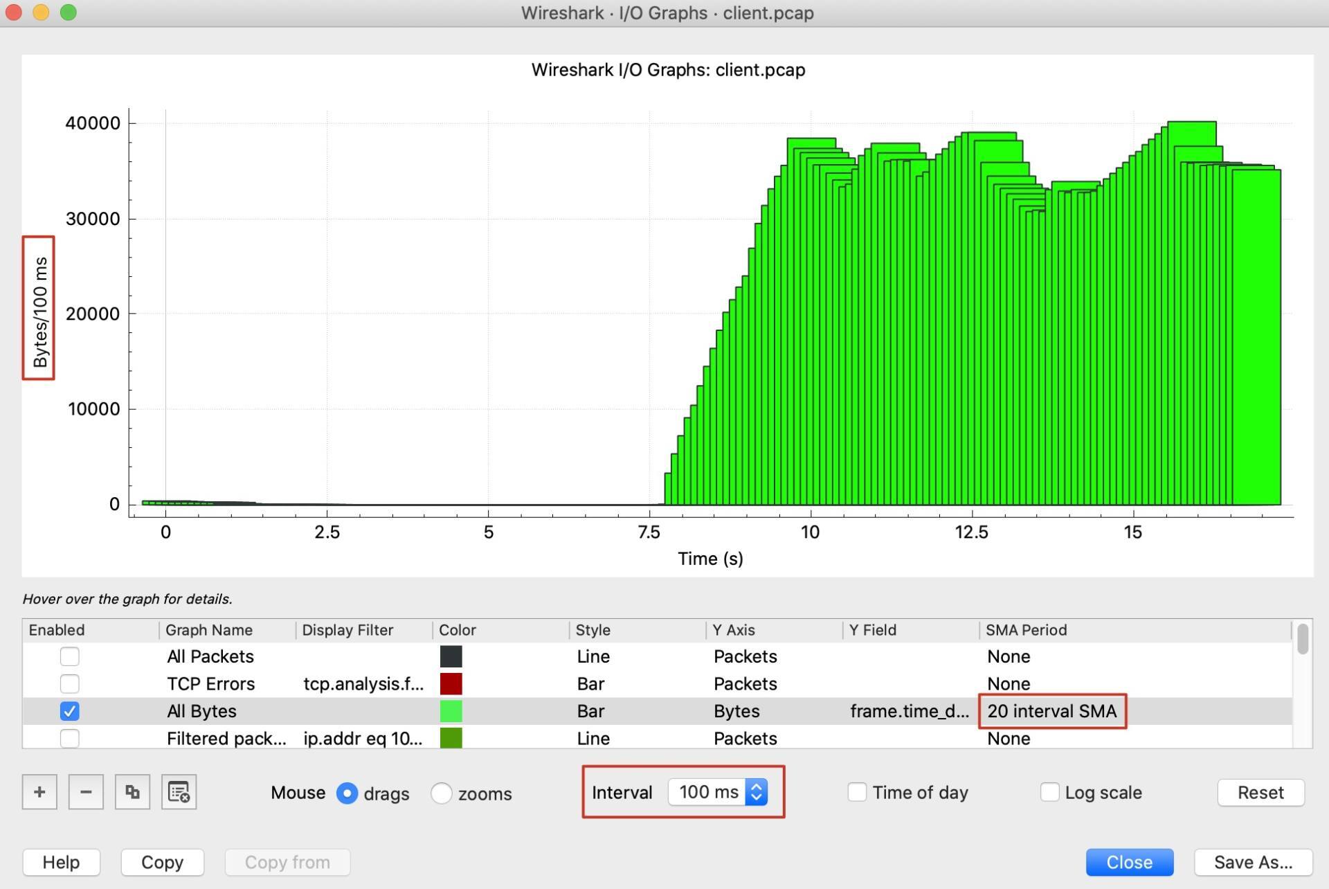 补充:如果你用Wireshark查看到的I/O Graph跟我这里的不同,那可以对比一下Interval和SMA period这两个配置是否跟图中的一致。