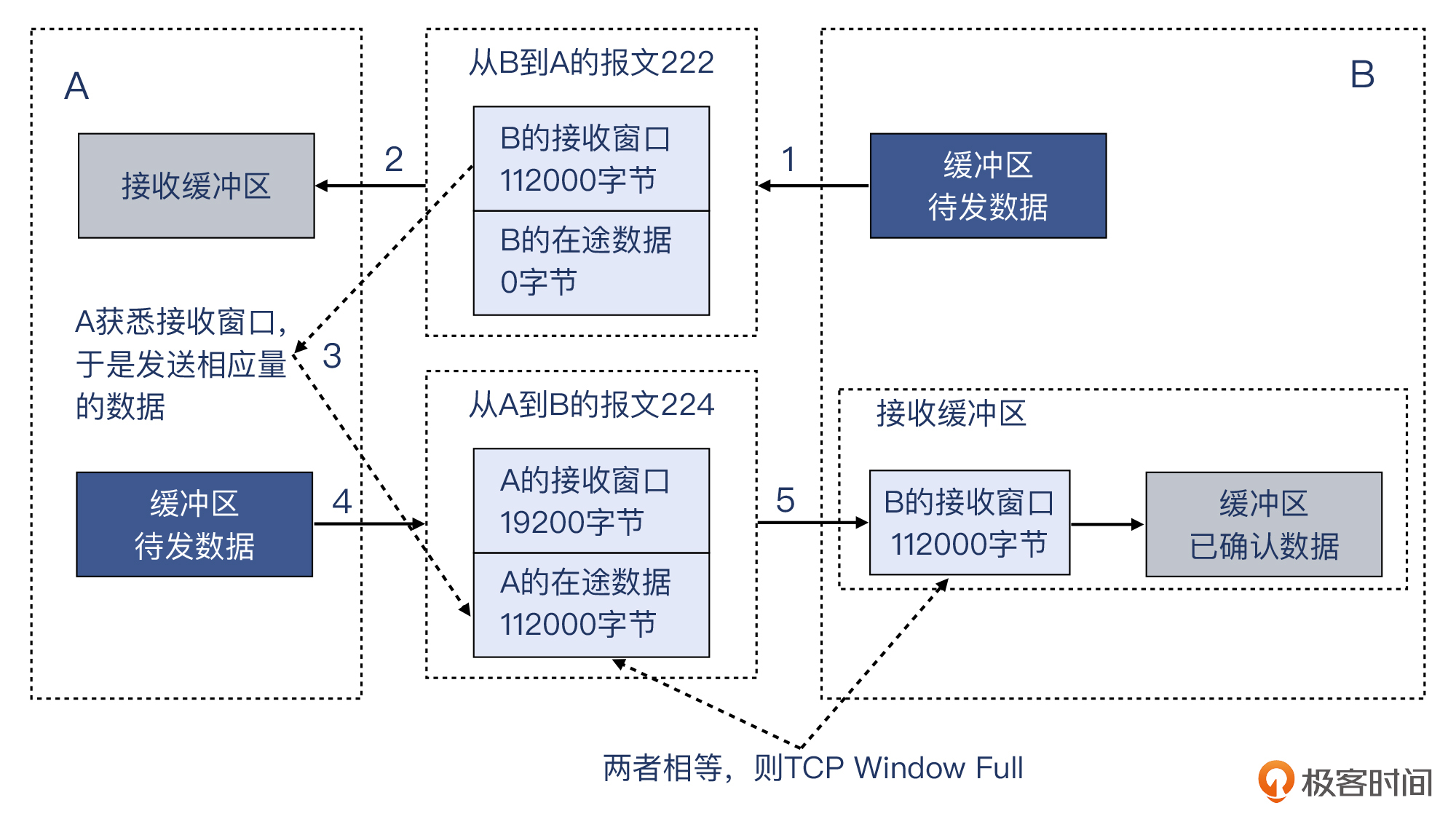 可以看到,这个报文的接收窗口就是112000,正好等于前面224号报文的Bytes in flight的112000字节。所以,我把前面的示意图改进一下供你参考。这里面的信息比较多,建议你耐心多花几分钟时间来充分理解其中的机制:
