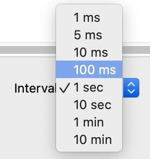 这个图不能说不对,但柱子比较粗,看起来不是很精确。这是因为,它默认是以1秒为间隔而计算的速度。但是TCP传输中途,很可能每过几毫秒都有所变化,所以,如果我们要看更加精细的图,可以调整一下粒度,把Interval从1sec改为100ms,看看会怎么样: