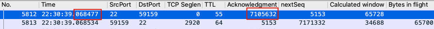 在22:30:39.067477,接收端的确认号为7105632: