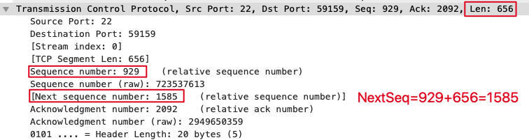 TCP的下个序列号(Next Sequence Number)等于序列号和段长度之和,即NextSeq = Seq + Len。