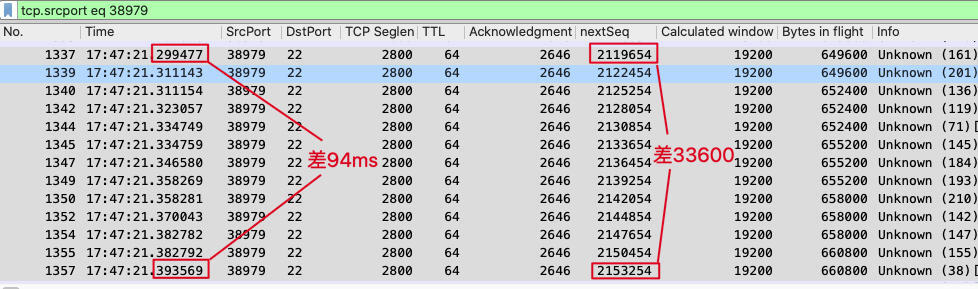 我们再用改进后的公式来计算这次的速度。我们可以选择传输中间偏后面一点的报文来做分析。比如下图中,我们选择1337号和1357号报文为起始和截止点,计算NextSeq的差值,还有时间的差值,然后两个差值相除。