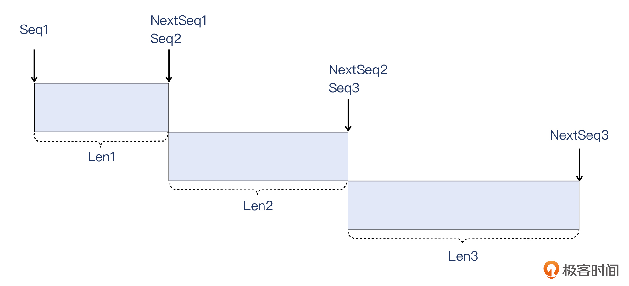 这也不难理解,因为TCP字节流是连续的,那么既然Seq + Len是这个报文的数据截止点,自然也是下一个报文的起始点,你可以参考这个示意图: