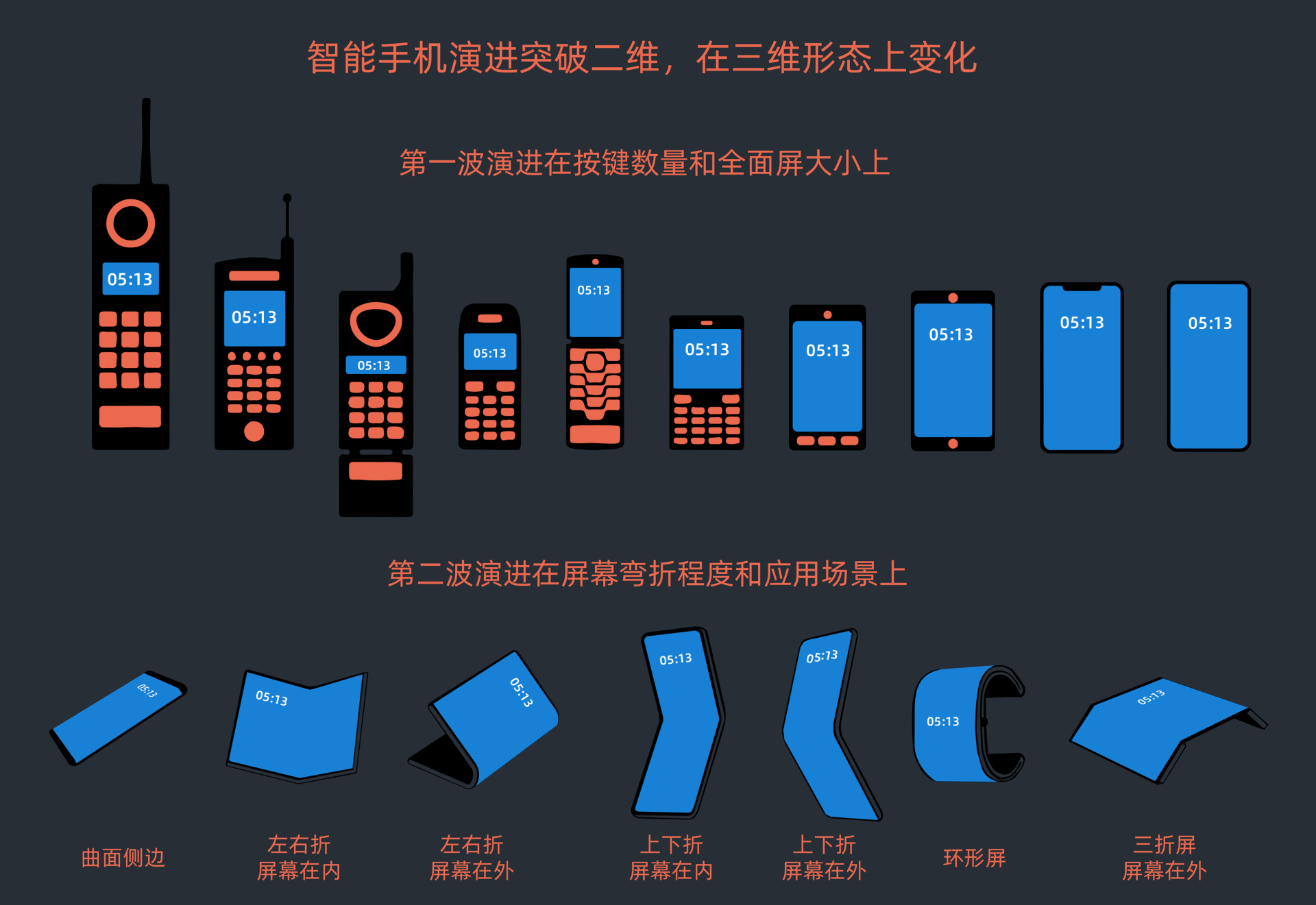 智能手机演进从一开始的仅减少物理按键、屏幕越来越大直到变成全面屏后,在二维演进方向上已经没有了太多的发挥空间。在柔性屏技术的加持下,开始从立体屏幕和多块屏幕的维度演进变化。下面我分别给出了这两波变化演进的示意图,其中第二波演变还在进行当中。