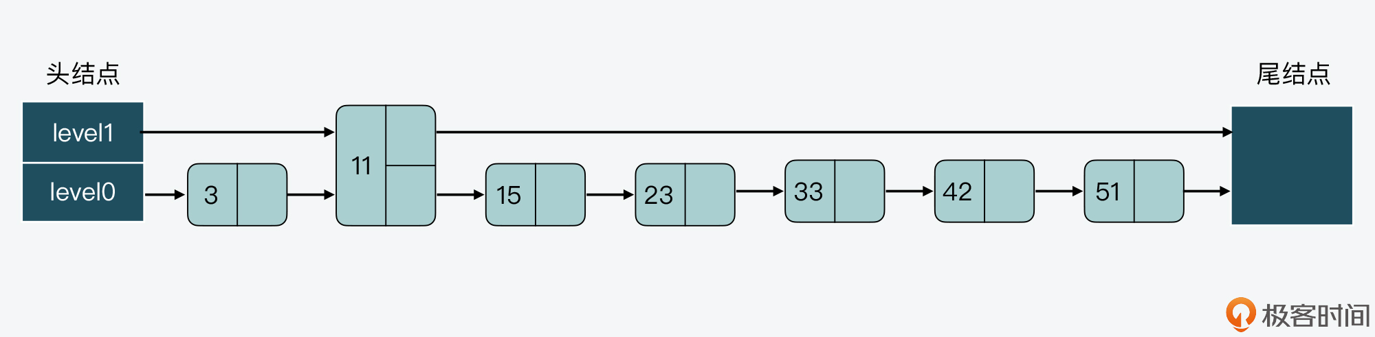 可以看到,在level 0上一共有7个结点,分别是3、11、23、33、42、51、62,这些结点会通过指针连接起来,同时头结点中的level0指针会指向结点3。然后,在这7个结点中,结点11、33和51又都包含了一个指针,同样也依次连接起来,且头结点的level 1指针会指向结点11。这样一来,这3个结点就组成了level 1上的所有结点。