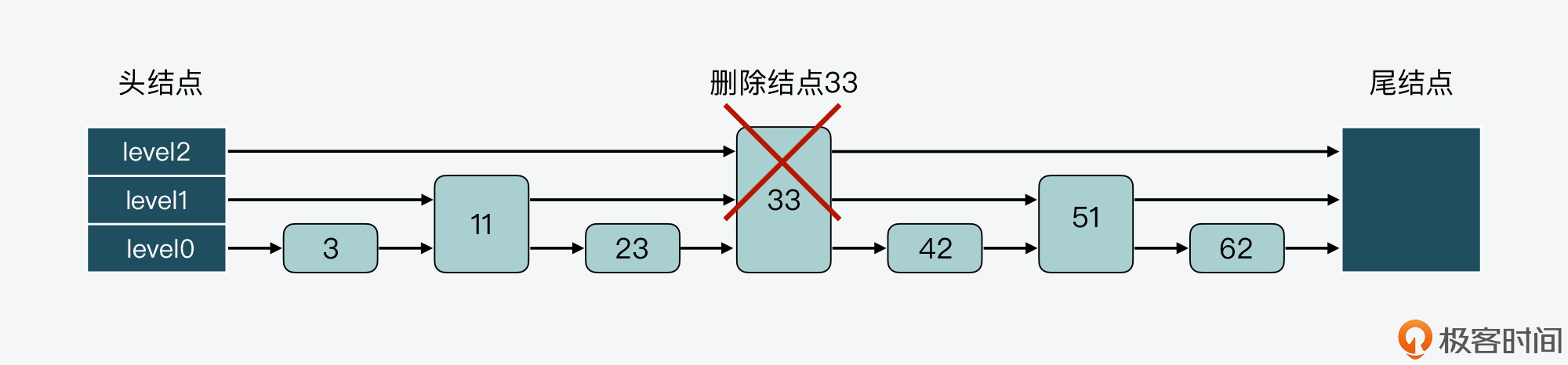类似的,如果我们要在有7个结点的跳表中删除结点33,那么结点33后面的所有结点都要进行调整: