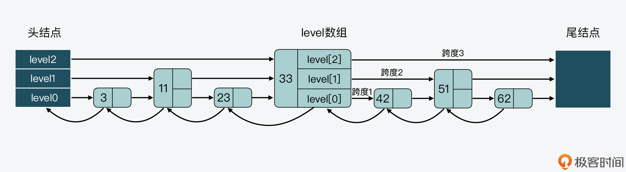 我们来看下面这张图,其中就展示了33结点的level数组和跨度情况。可以看到,33结点的level数组有三个元素,分别对应了三层level上的指针。此外,在level数组中,level 2、level1和level 0的跨度span值依次是3、2、1。