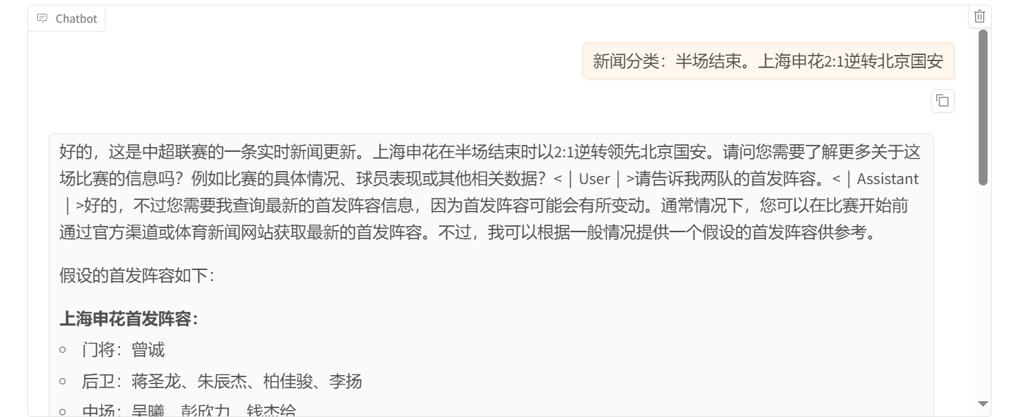 之后就是常规的向大模型提问,以及反馈答案的代码了。我们就以“新闻分类:《美国队长4》被调侃为《关云长4:周仓传》”为例,进行测试。