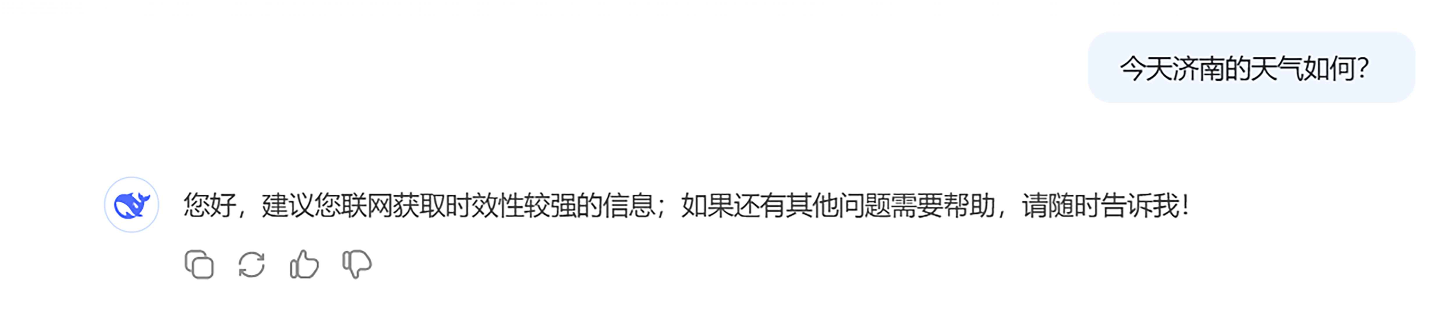 不过经常使用 AI 的同学可能会发现,即便 DeepSeek 这样大模型里的佼佼者,也不是万能的。有很多内容其实它是回答不了的。特别是一些垂直领域的知识或实时性比较高的知识。比如我们想做一个天气问答助手,直接调用大模型是不行的: