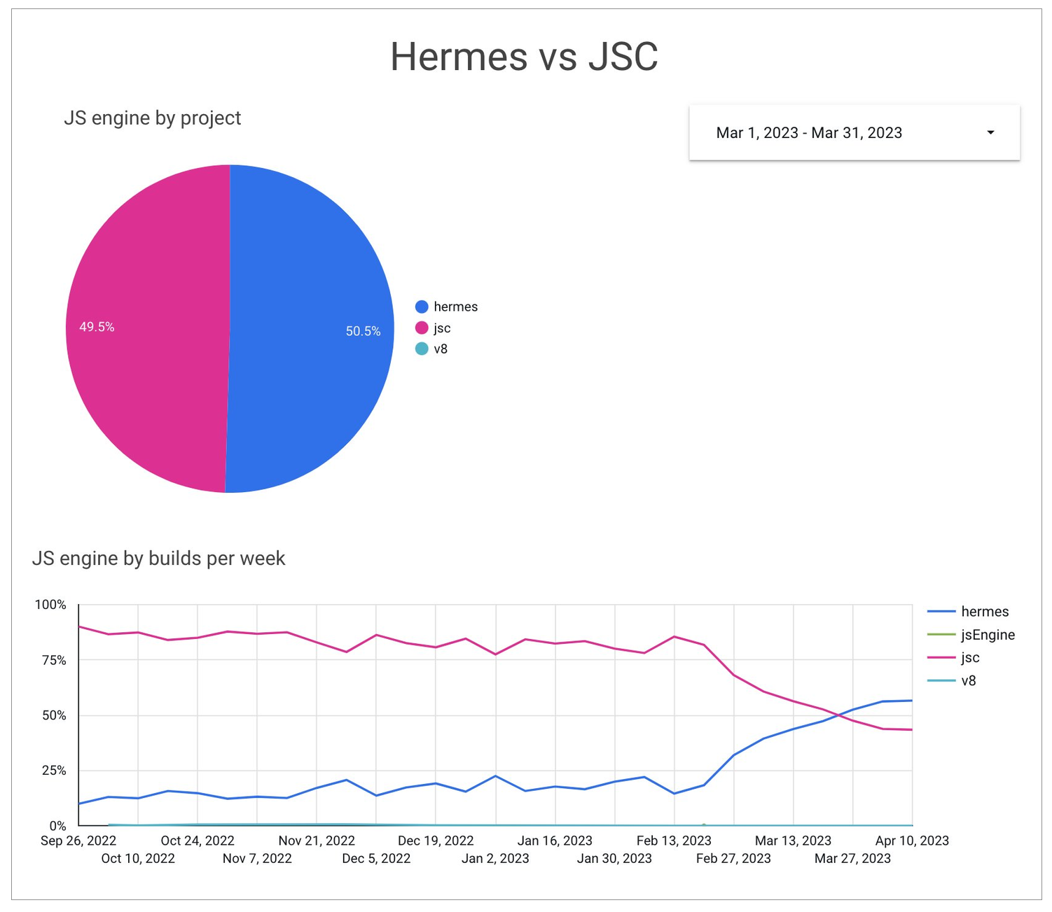 另外,已经有更多的开发者开始选择 Hermes 引擎。根据 Expo 公开的数据,到 2023 年 3 月,在其平台上,使用 Hermes 引擎构建的项目数量已经超过了使用 JavaScript Core 引擎的数量。因此,Expo 强烈建议 React Native 开发者和 Expo SDK 的用户们都切换到 Hermes 引擎,以便享受到 Hermes 引擎带来的诸多优势,如改进的调试体验,特别是性能改善。