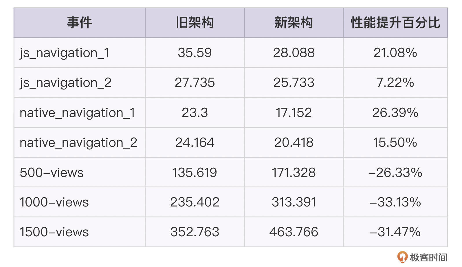 优化后,官方通过在ScrollView组件中大量渲染View、Text或Image组件(1500或5000个),以测试新架构的性能。根据官方给出的性能测试报告,Android的渲染性能提升了0%~8%,而iOS的提升更为明显,达到了13%~39%。