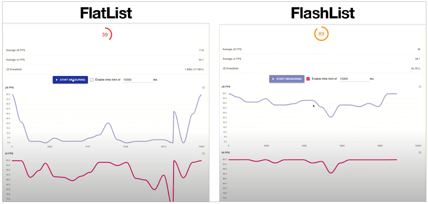例如,一位社区成员在他的帖子中测试了FlatList(Virtualized)和ScrollView(Non Virtualized)组件,以及渲染导航组件和View组件的性能。