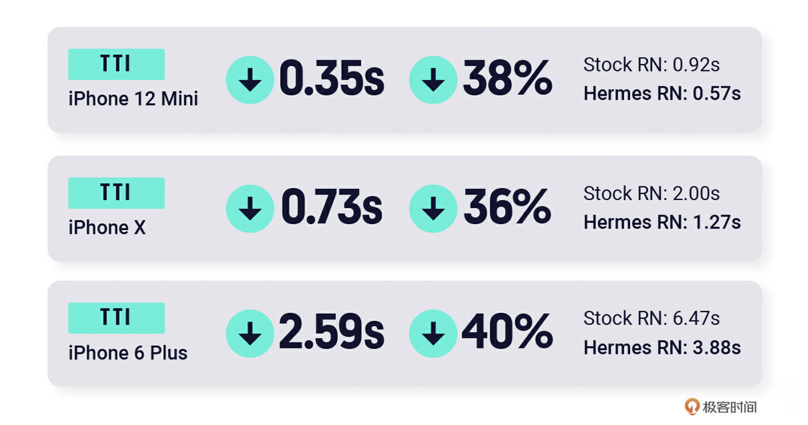 在启动性能上,使用字节码技术的 Hermes 明显优于 JavaScriptCore。根据 CallStack 团队在 2021 年公开的实测数据,对于冷启动的可交互时间(TTI),在三款不同的 iOS 机型上,Hermes 比 JavaScriptCore 快了 36%~40%。我们的团队在今年也进行了类似的启动时间性能测试,结果显示,iOS 和 Android 的性能分别提升了 50% 和 48%。