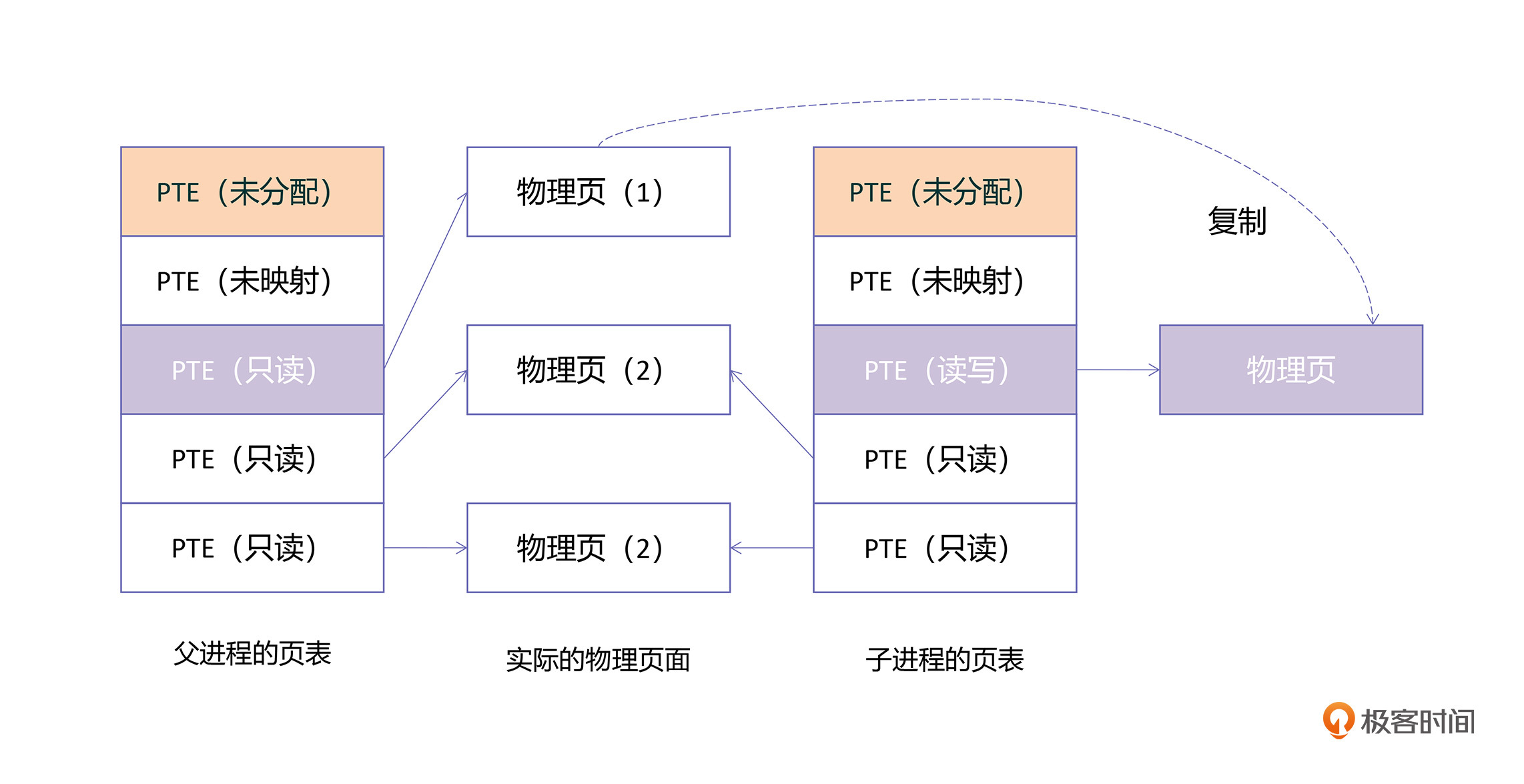 当父进程再访问到这个地址时,也会触发一次写保护中断,这时系统发现物理页的引用计数为1,那就只要把父进程PTE中的权限,简单地从只读变为读写就可以了。这个过程比较简单,我就不画图了,你可以自己思考一下。