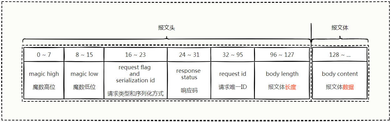 - request flag and serialization id:请求类型和序列化方式,占用 8 bit,也就是 1 byte。前面 4 bit 是请求类型,后面 4 bit 是序列化方式,合起来用 1 个 byte 来表示。