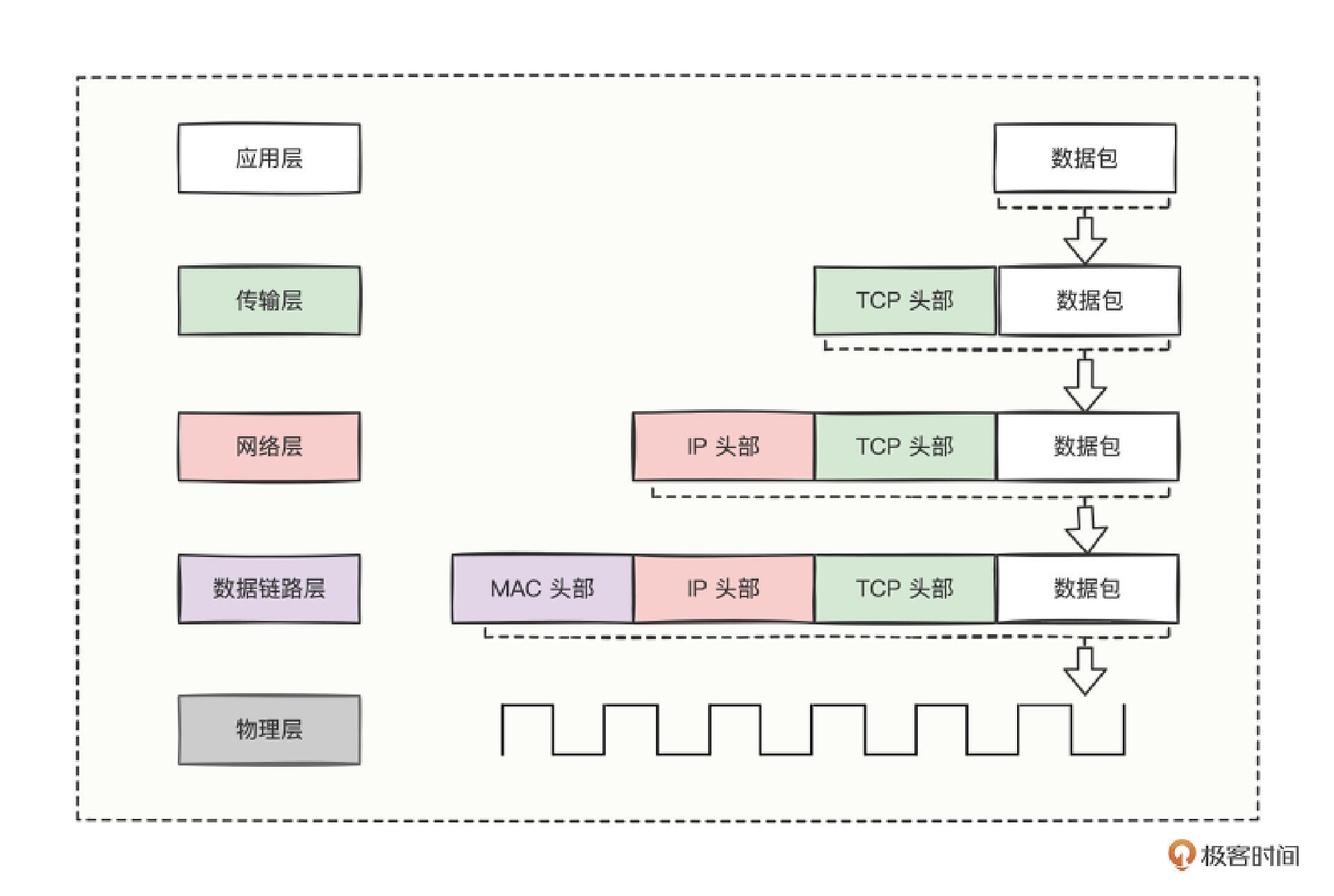 比如,应用层的数据包+TCP头部就是传输层的帧格式,传输层的数据包+IP头部就是网络层的帧格式,网络层的数据包+MAC头部就是数据链路层的帧格式,最后,会把数据链路层的整个数据包,变成比特流,通过工作在物理层的网卡、网线或光纤发送出去。