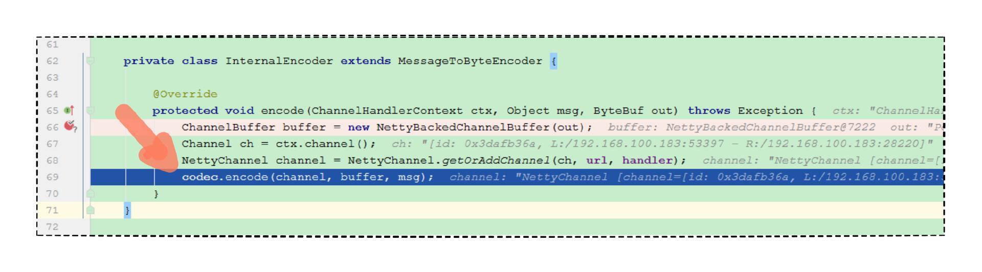 实践是检验真理的唯一标准,我们打个断点去 Debug 调试一下。启动 ZooKeeper 和提供方,然后 Debug 启动消费方,一会就来到了 encode 方法: