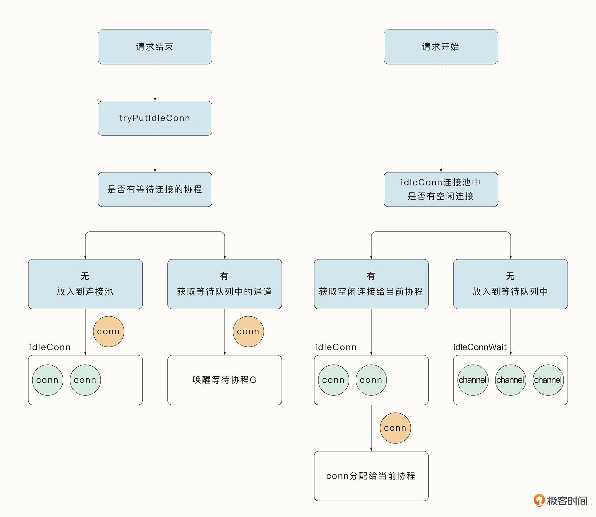 这种巧妙的设计依托了轻量级协程的优势,获取连接的具体流程如下图右侧所示:
