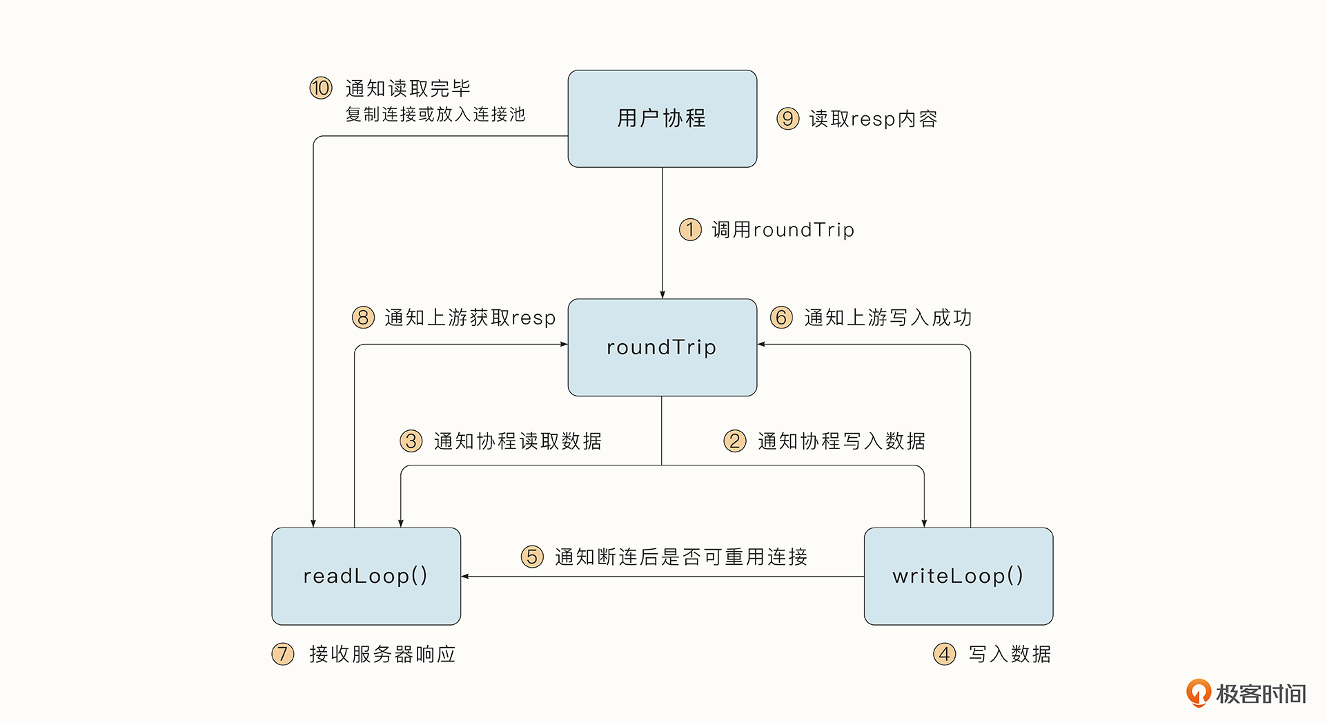 HTTP请求调用的核心函数是roundTrip,它会首先传递请求给writeLoop协程,让writeLoop协程写入数据。接着,通知readLoop协程让它准备好读取数据。等writeLoop成功写入数据后,writeLoop会通知readLoop断开后是否可以重用连接。然后writeLoop会通知上游写入是否成功。如果写入失败,上游会直接关闭连接。