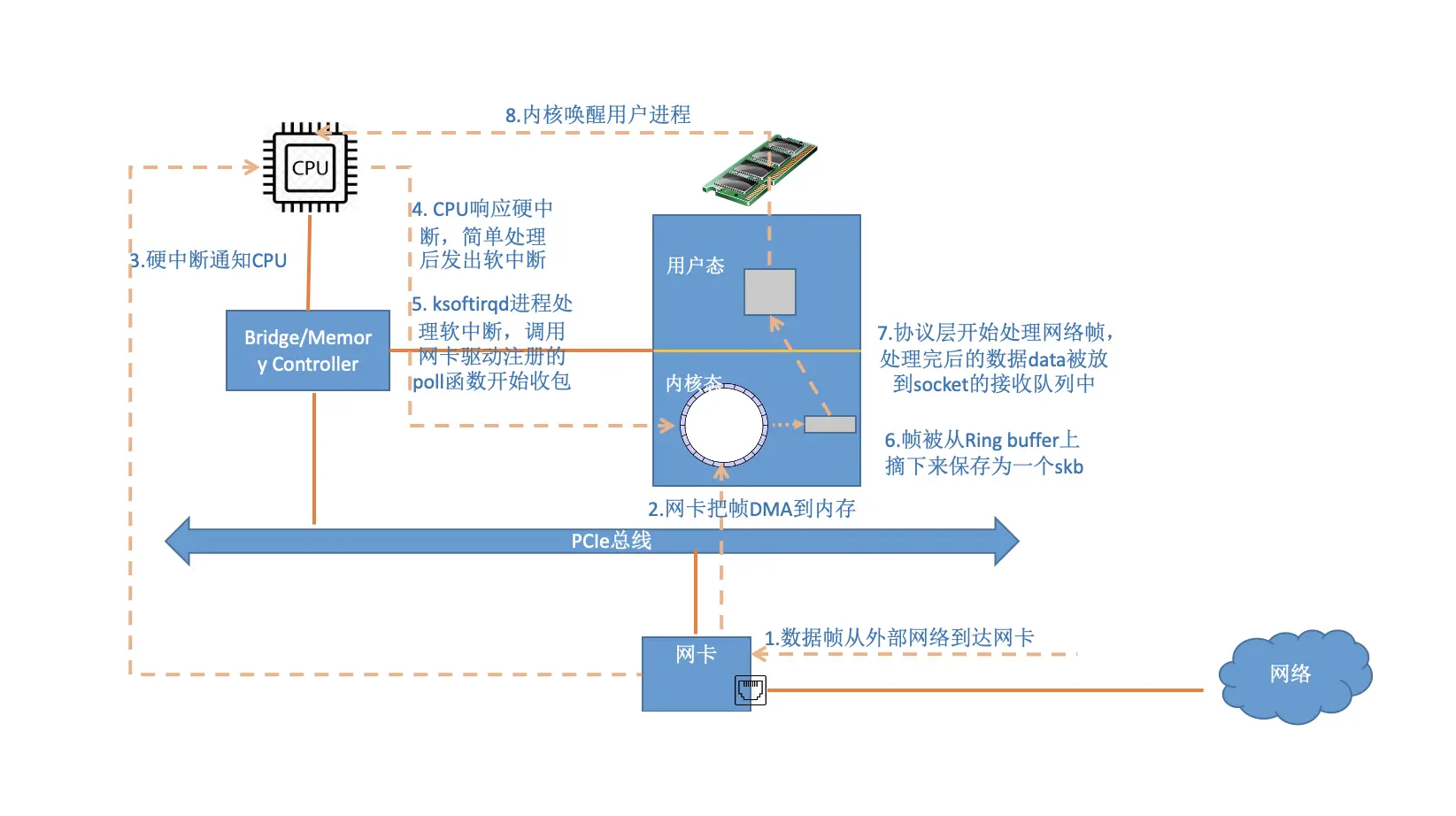 当网络设备接收到数据,并储存到设备的缓冲区后(该缓冲区可能位于设备的内存,也可能通过 DMA 写入到主机内存),会首先通知操作系统内核对已接收的数据进行处理。