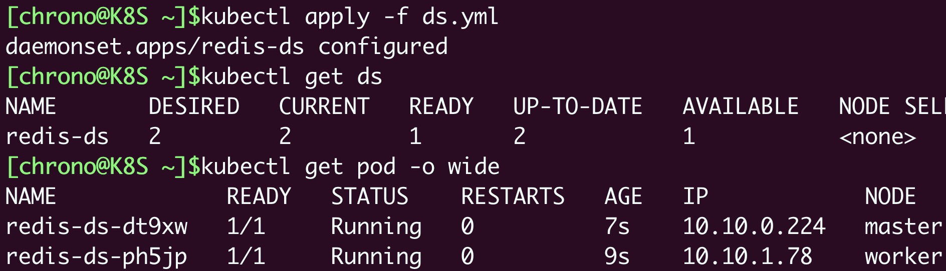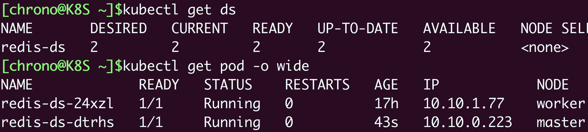 你就会看到DaemonSet仍然有两个Pod,分别运行在Master和Worker节点上,与第一种方法的效果相同。