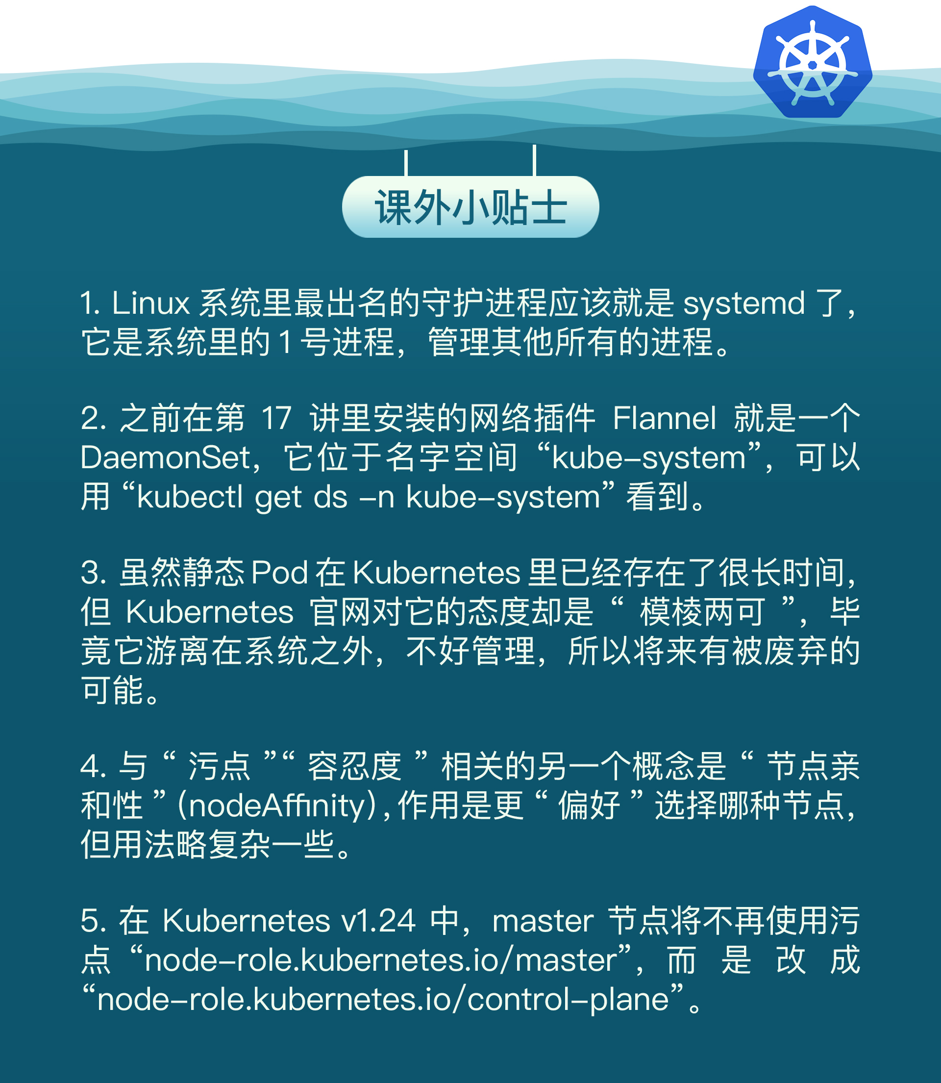 好了,今天我们学习了Kubernetes里部署应用程序的另一种方式:DaemonSet,它与Deployment很类似,差别只在于Pod的调度策略,适用于在系统里运行节点的“守护进程”。