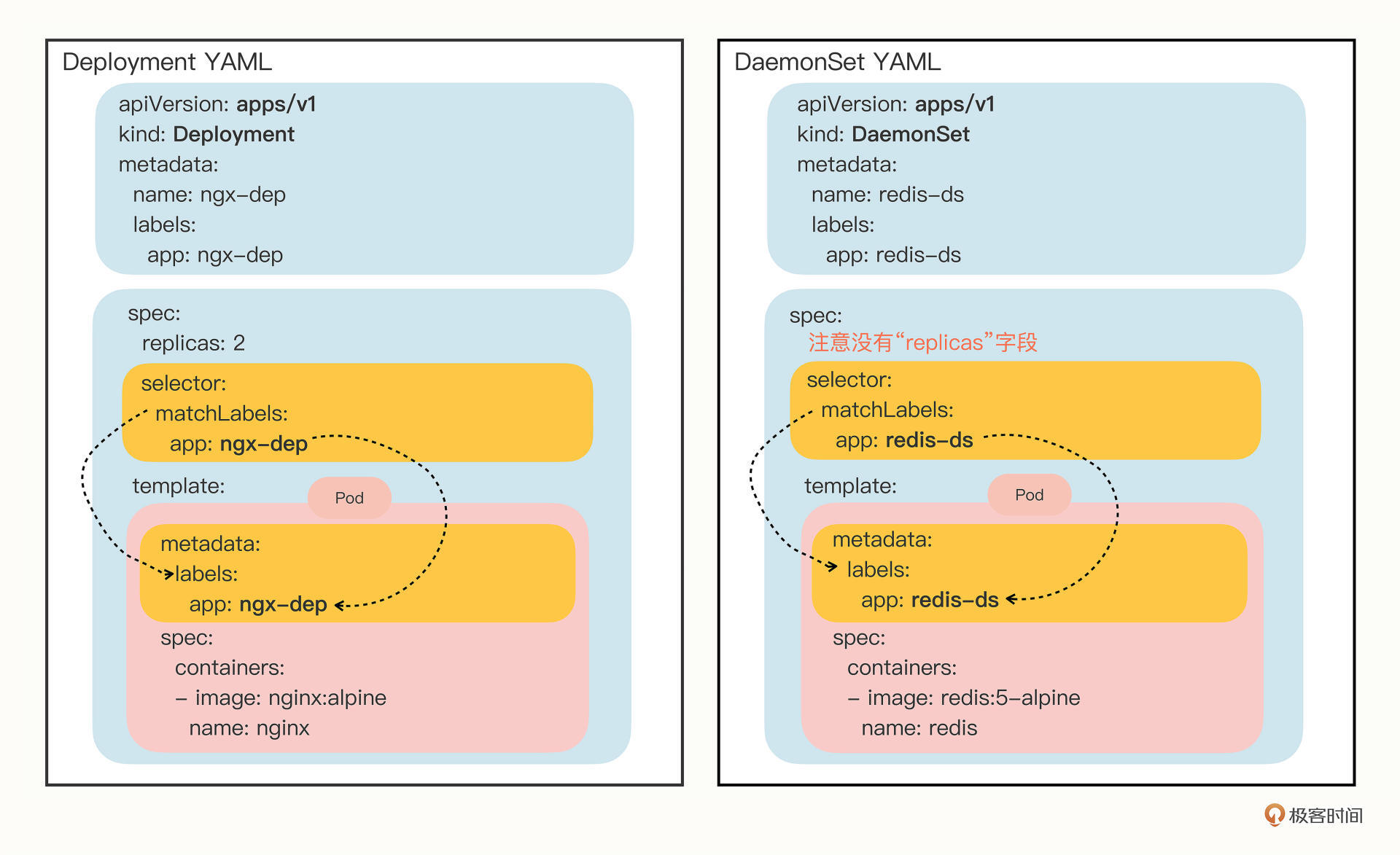 我还是把YAML描述文件画了一张图,好让你看清楚与Deployment的差异: