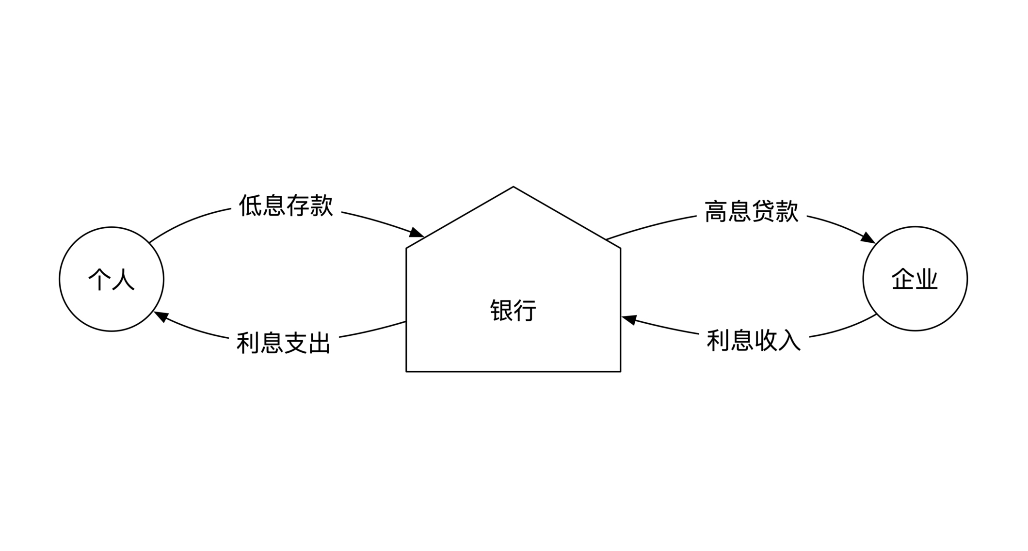 这时候银行作为中介机构就站了出来。有钱人把手上的钱用低的利息存进银行,银行马上转手把钱用高的利息贷款给你。通过将利息低买高卖,银行就能“躺着赚钱”了。下面这幅图展示了银行通过信贷业务赚钱的过程: