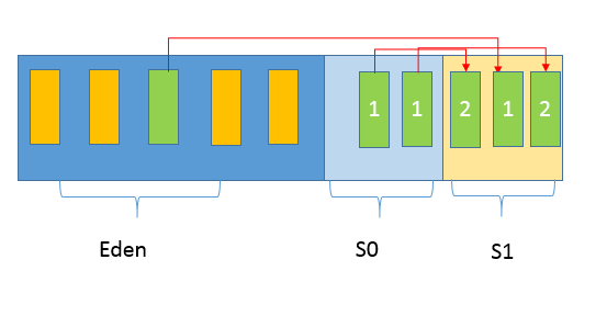 第一,Java应用不断创建对象,通常都是分配在Eden区域,当其空间占用达到一定阈值时,触发minor GC。仍然被引用的对象(绿色方块)存活下来,被复制到JVM选择的Survivor区域,而没有被引用的对象(黄色方块)则被回收。注意,我给存活对象标记了“数字1”,这是为了表明对象的存活时间。