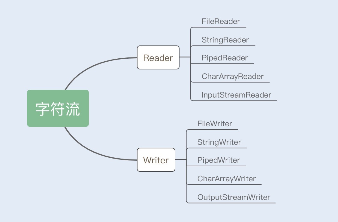 Reader/Writer是字符流的抽象类,这两个抽象类也派生出了若干子类,不同的子类分别处理不同的操作类型,具体内容如下图所示: