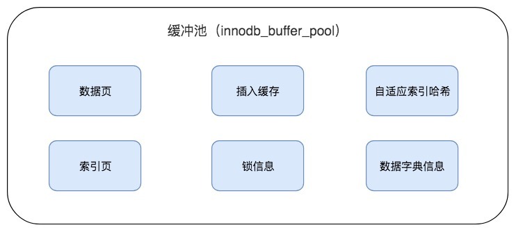 从图中,你能看到InnoDB缓冲池包括了数据页、索引页、插入缓冲、锁信息、自适应Hash和数据字典信息等。