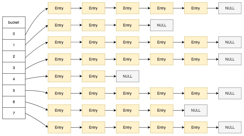 Hash表是数组+链表的形式。通过Hash函数可以计算索引键值所对应的bucket(桶)的位置,如果产生Hash冲突,就需要遍历链表来解决。