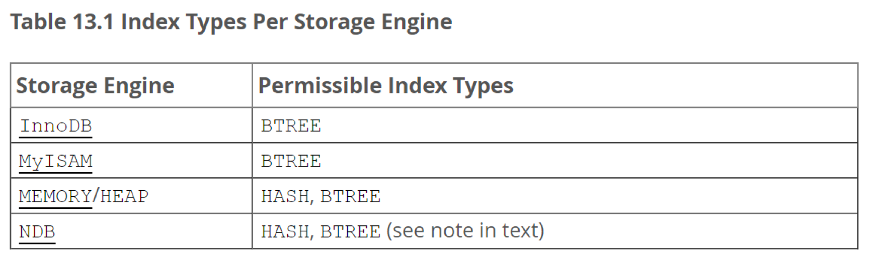 如果使用的是MySQL的话,我们需要了解MySQL的存储引擎都支持哪些索引结构,如下图所示(参考来源 https://dev.mysql.com/doc/refman/8.0/en/create-index.html)。如果是其他的DBMS,可以参考相关的DBMS文档。