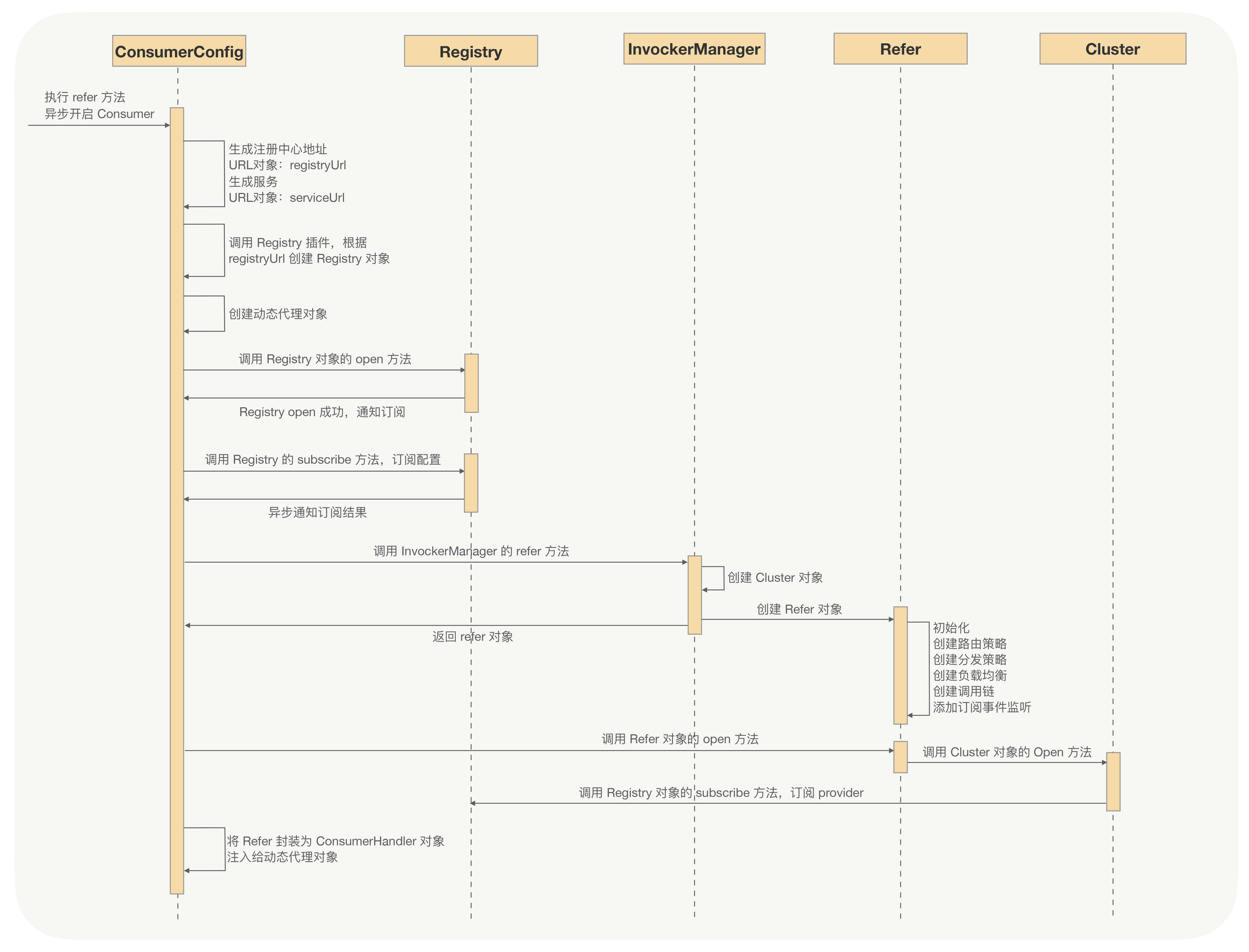 - ConsumerConfig调用Refer对象封装到ConsumerInvokerHandler中,将ConsumerInvokerHandler对象注入给动态代理对象。