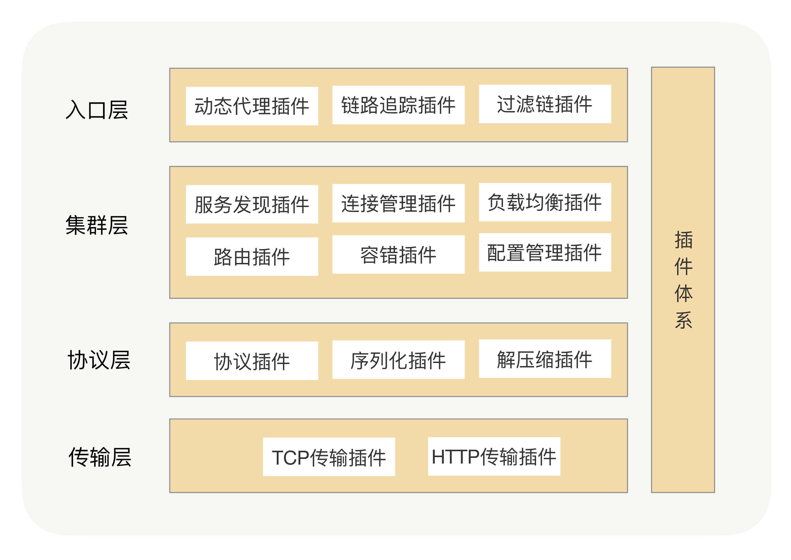 首先说我们RPC框架的整体架构,这里请你回想下[[第 07 讲]],在这一讲中我讲解了如何设计一个灵活的RPC框架,其关键点就是插件化,我们可以利用插件体系来提高RPC的扩展性,使其成为一个微内核架构,如下图所示:
