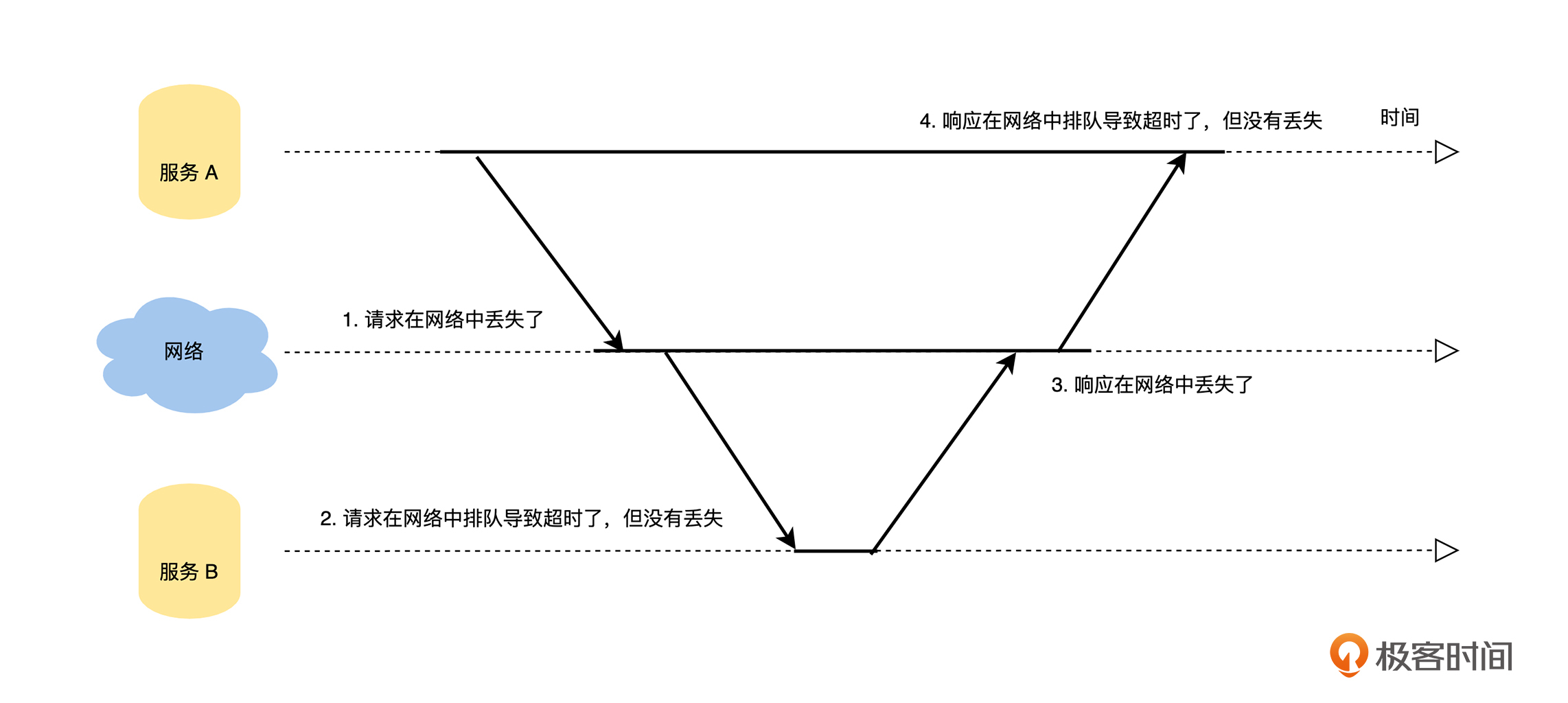 在响应超时的情况下,如果调用方想确保这个请求被执行,只能重新发送刚刚的请求。但是,如果之前的请求只是在网络中延迟或者响应丢失了,例如上面 2、3 和 4 中描述的情况,重试操作会导致这个请求被多次执行;如果之前的请求在网络中丢失了,例如上面 1 描述的情况,那么调用方不进行重试的话,这个请求就会出现一次都没有被执行过的情况。