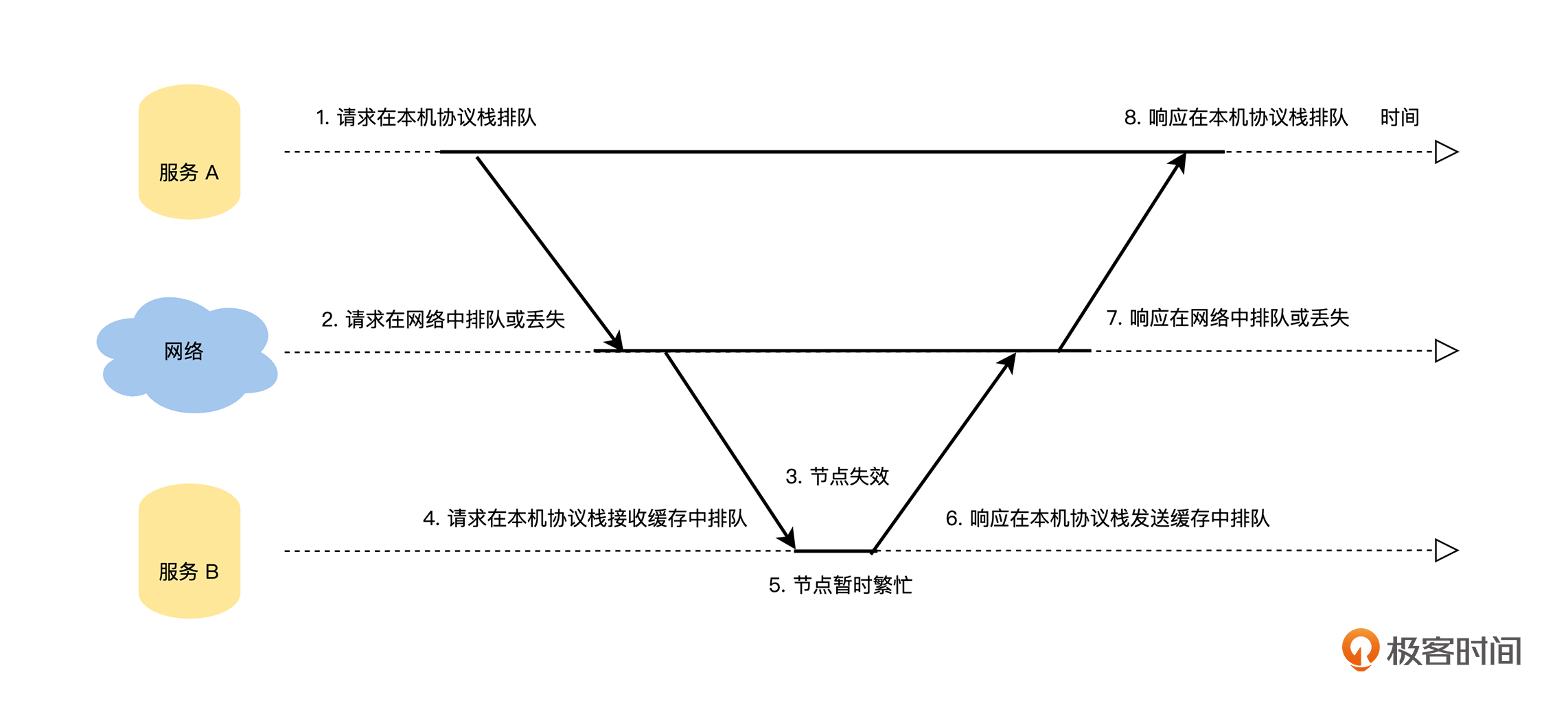 所以你会发现,远程调用在时间上有不确定性,那么我们就来讨论一下,服务 A 通过网络远程调用服务 B 可能会出现哪些不确定的情况。在我们使用极客时间 App 的过程中,如果出现加载不出来或者系统内部错误的问题,主要和远程调用模型面临的网络排队、丢包和请求服务崩溃等情况有关,具体的场景和示意图如下: