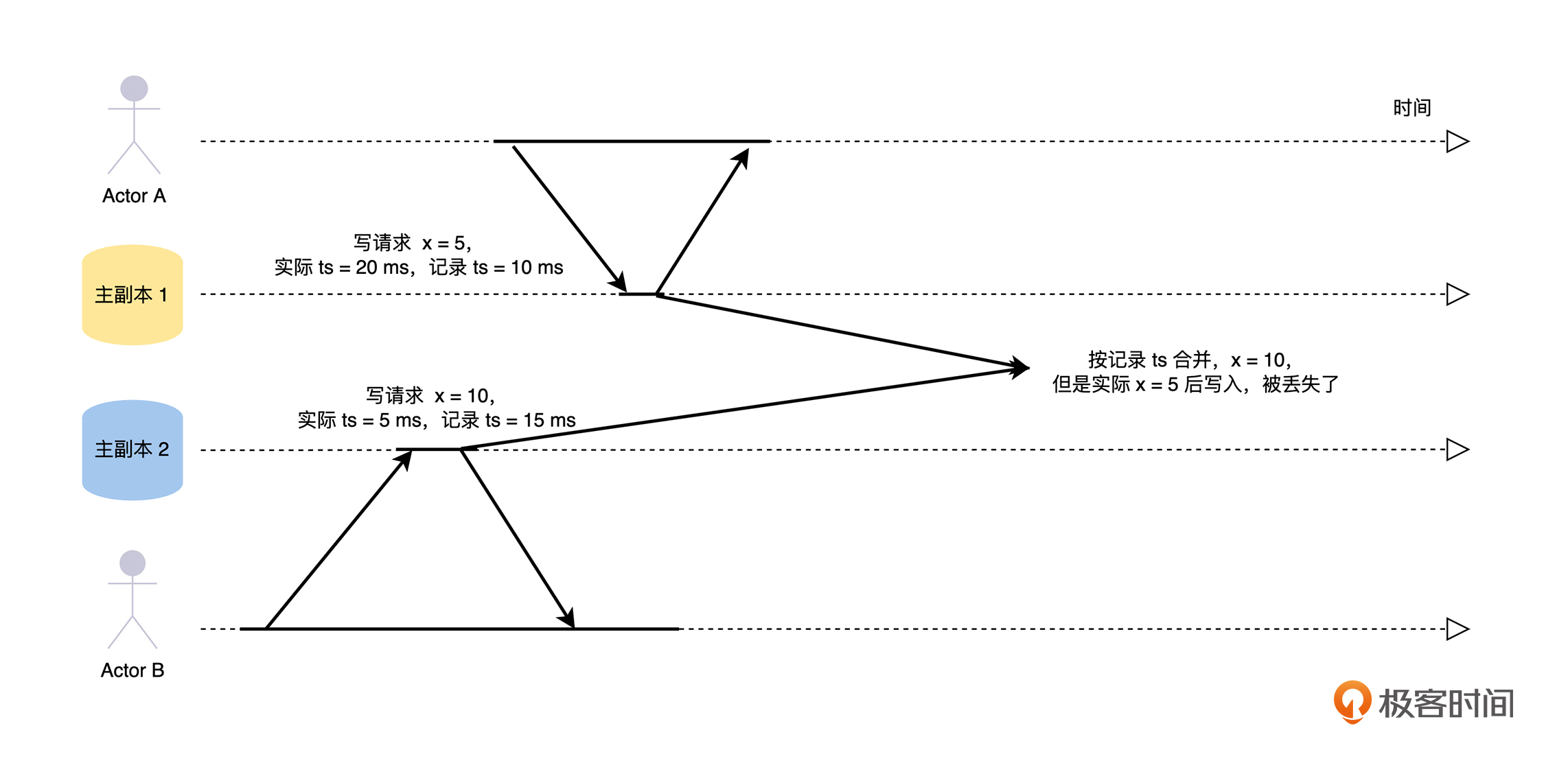 比如在多主复制的情况下,客户端 A 在主副本 1 修改了 x = 5,记录时间为 10 ms,但是该副本时间慢了 10 ms,所以实际时间为 20 ms。几乎同一时间,客户端 B 在主副本 2 修改了 x = 10,记录时间为 15 ms,但是该副本时间快了 10 ms,所以实际时间为 5 ms。