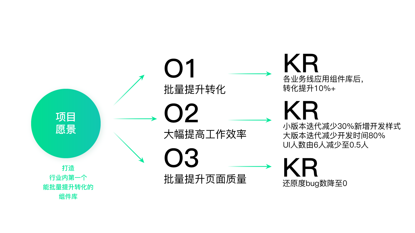 基于此,我们最终定下的项目愿景是:打造行业内第一个能批量提升转化的组件库。围绕这个愿景,对应得到三个O(目标),分别是:批量提升转化、大幅提升工作效率、批量提升页面质量。