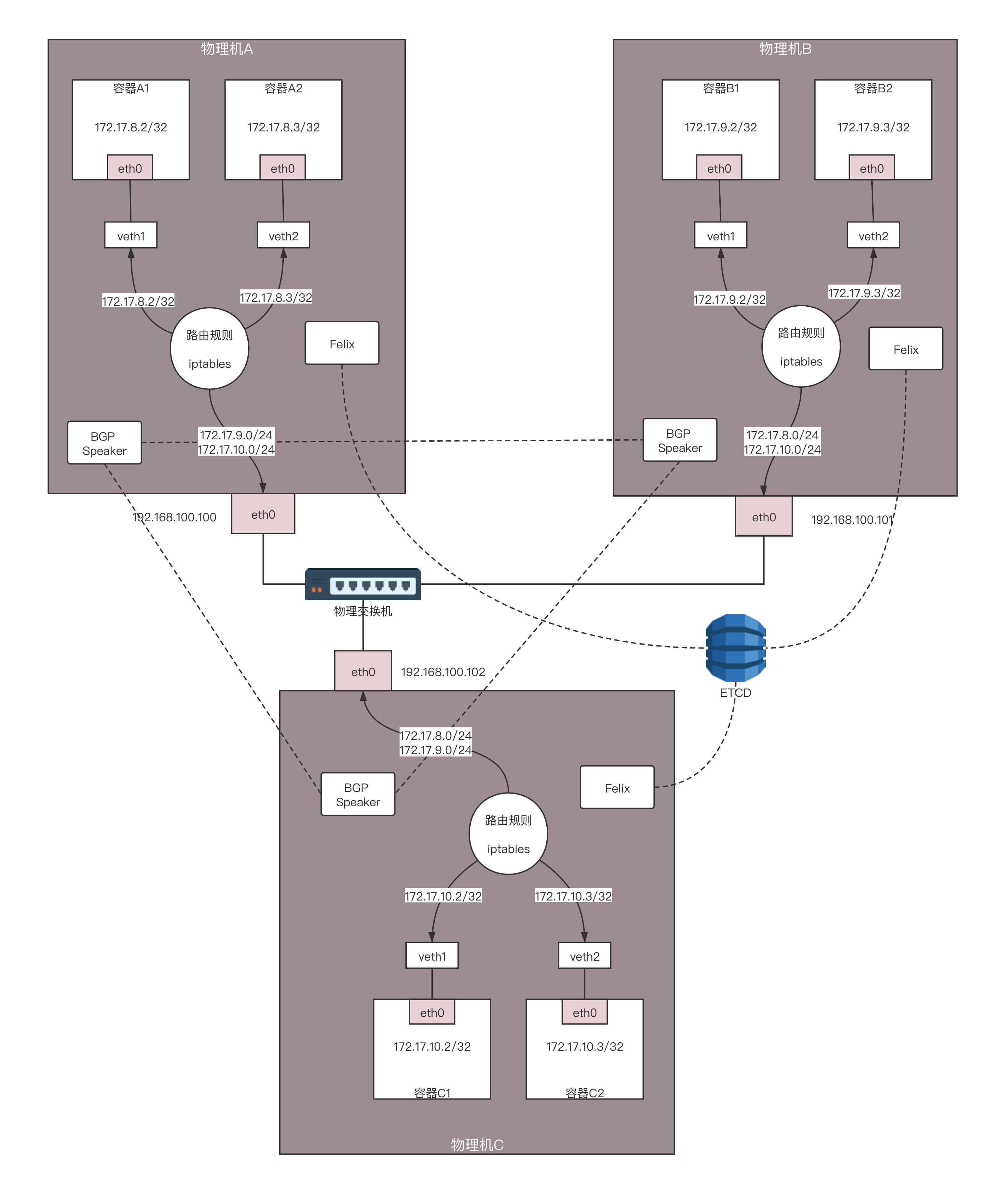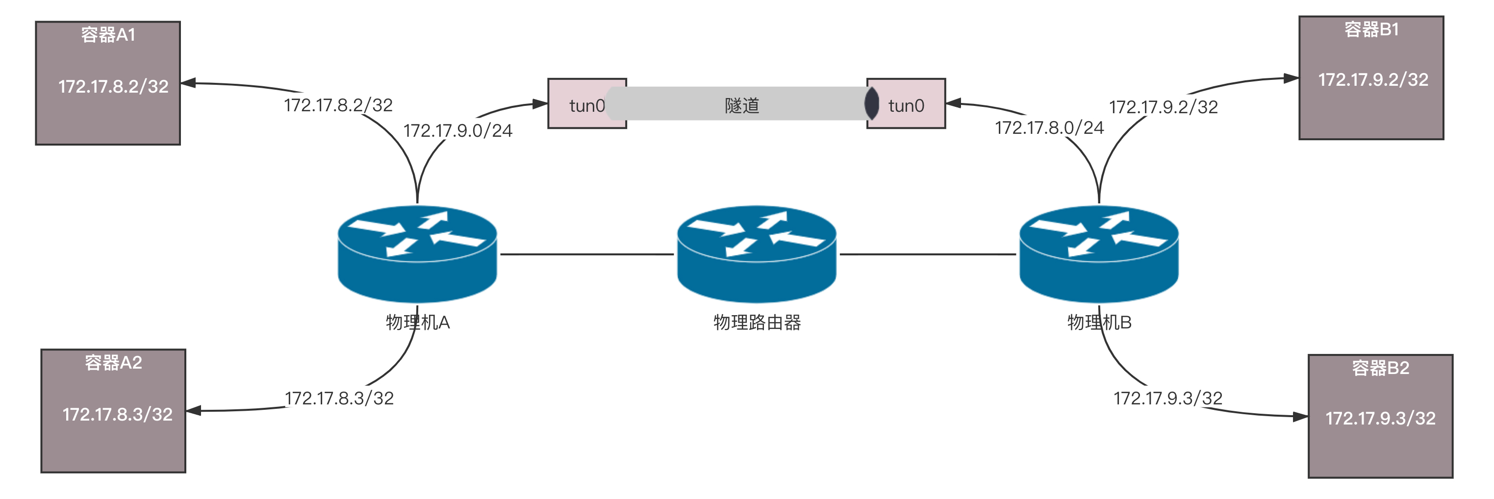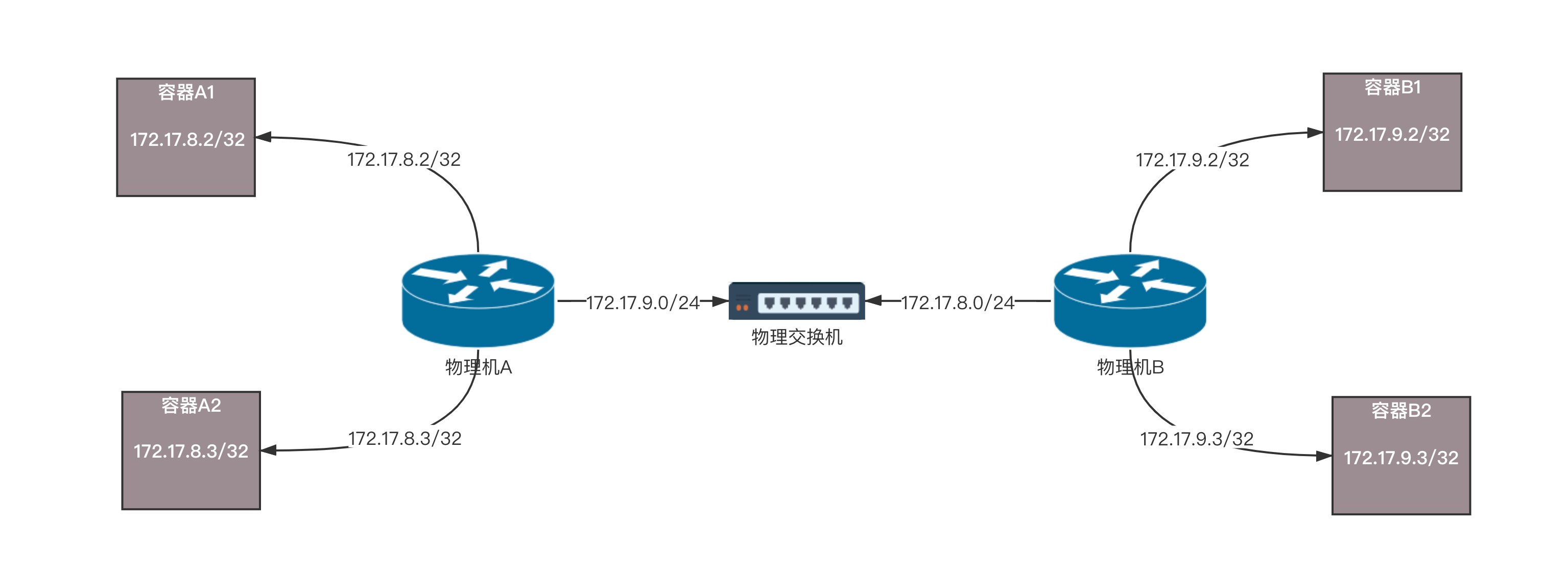 在物理机A上有三条路由规则,分别是去两个本机的容器的路由,以及去172.17.9.0/24,下一跳为物理机B。