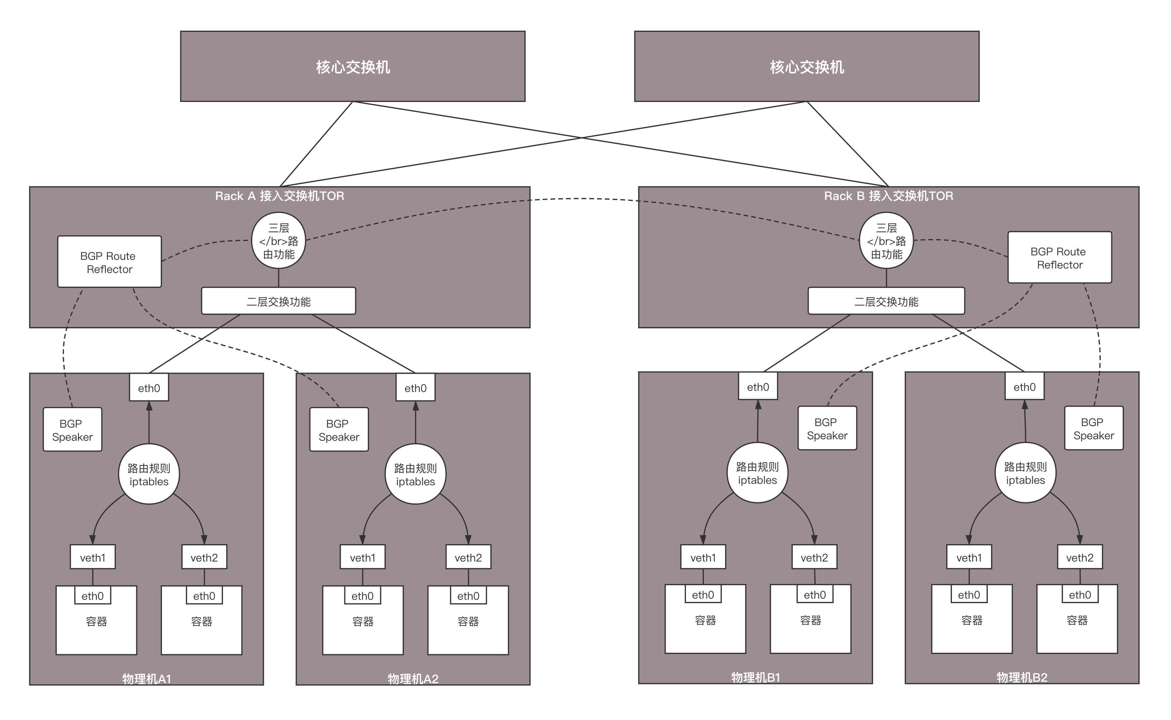 在接入交换机之间也建立BGP连接,相互告知路由,因而一个Rack里面的路由可以告知另一个Rack。有多个核心或者汇聚交换机将接入交换机连接起来,如果核心和汇聚起二层互通的作用,则接入和接入之间之间交换路由即可。如果核心和汇聚交换机起三层路由的作用,则路由需要通过核心或者汇聚交换机进行告知。