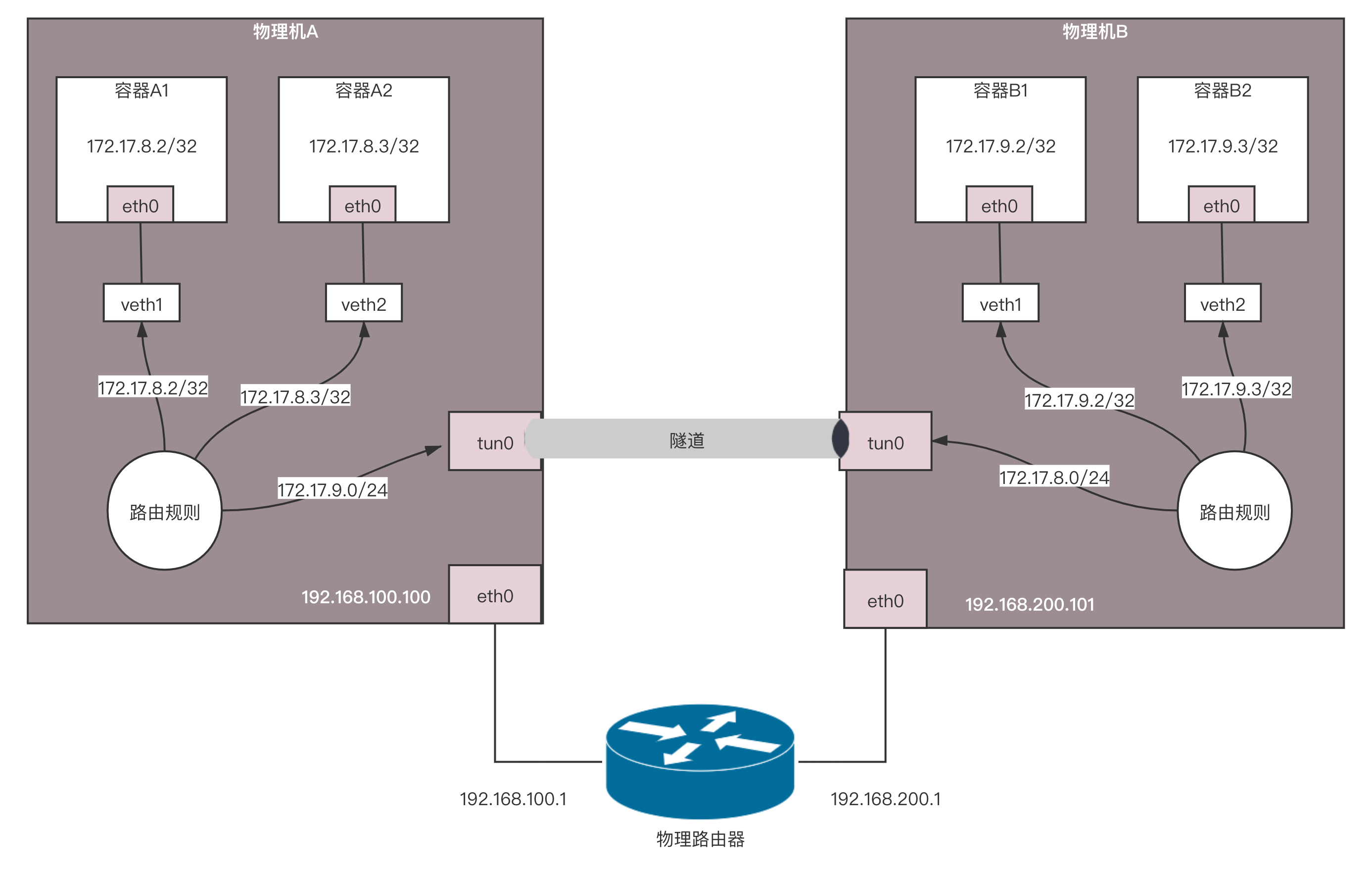 我们看刚才那张图的下半部分。物理机B上的容器要访问物理机A上的容器,第一跳就是物理机B,IP为192.168.200.101,第二跳是中间的物理路由器右面的网口,IP为192.168.200.1,第三跳才是物理机A,IP为192.168.100.100。